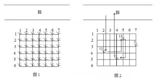 鲁宾逊先生和多多都很开心,因为花生正是他们的最爱。在告示牌背后,路边真的有一块花生田,花生植株整齐地排列成矩形网格(如图1)。有经验的多多一眼就能看出,每棵花生植株下的花生有多少。为了训练多多的算术,鲁宾逊先生说:“你先找出花生最多的植株,去采摘它的花生;然后再找出剩下的植株里花生最多的,去采摘它的花生;依此类推,不过你一定要在我限定的时间内回到路边。”